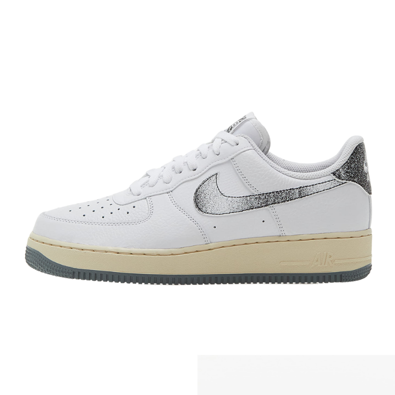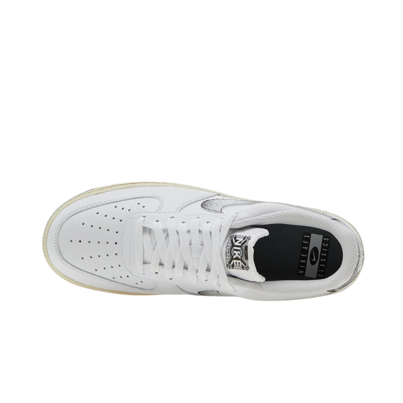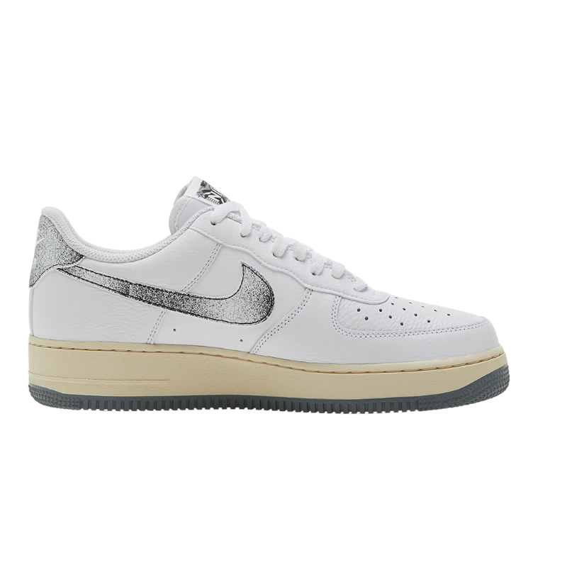 El Nike Air Force 1 Low "Classics 50 Years of Hip-Hop" celebra el 50 aniversario del hip-hop. Esta zapatilla baja presenta una combinación de colores blanco, playa y gris humo con cuero caído blanco y superposiciones tonales. El Swoosh y la lengüeta del talón están confeccionados con material moteado para brindar una apariencia metálica, mientras que la jaula de cordones incluye cordones de algodón con un dije de micrófono plateado. La etiqueta en la lengüeta imita un póster antiguo de un evento de hip-hop, que muestra "NIKE 50 YEARS OF HIP HOP" en letras negras.