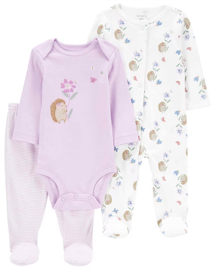 Confeccionado en suave algodón, este conjunto se compone de un body con diseño integral de lunares, un body de manga larga y pantalones.